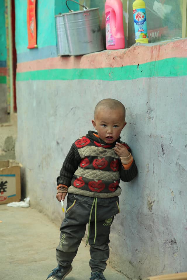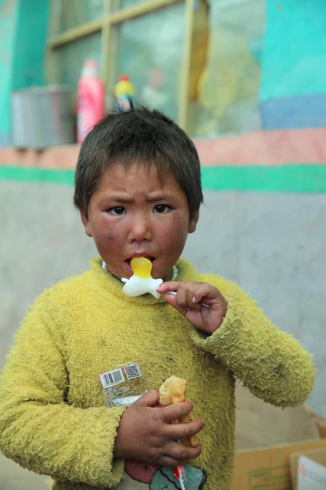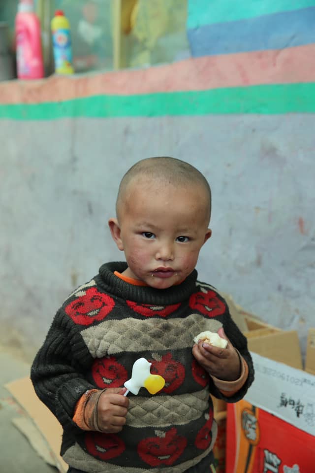 那最小的孩子捧著我們送的豬肉罐頭吃得津津有味,