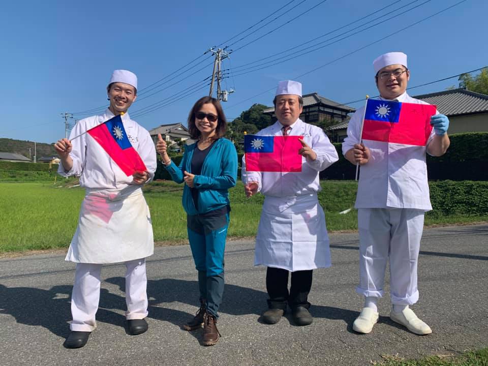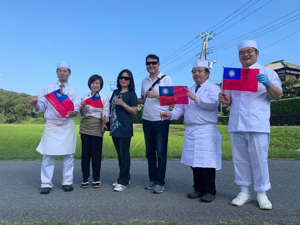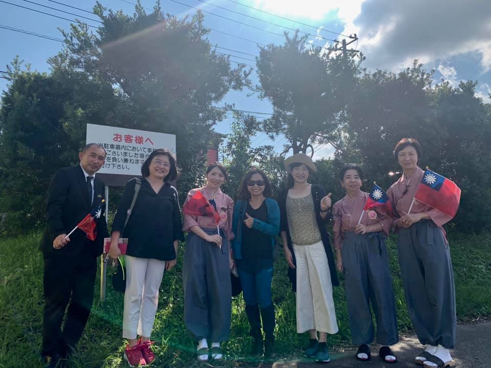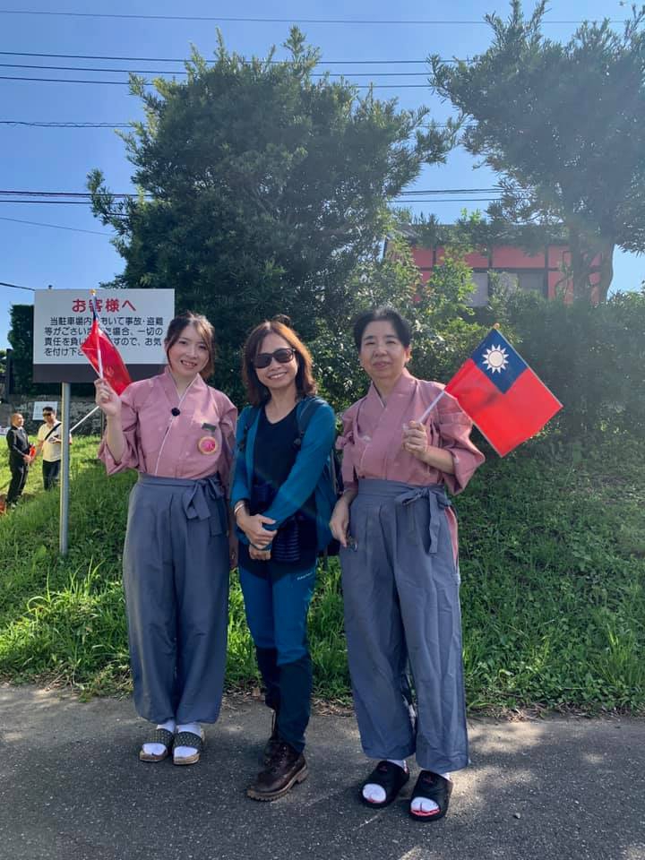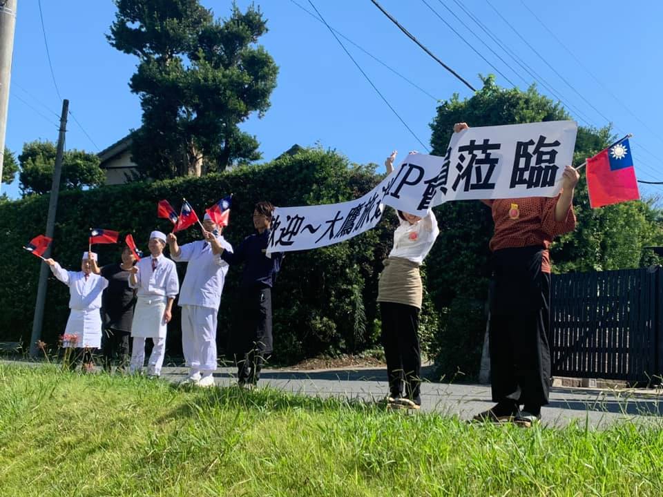 草坪高處站了一列揮舞國旗的歡迎人員,