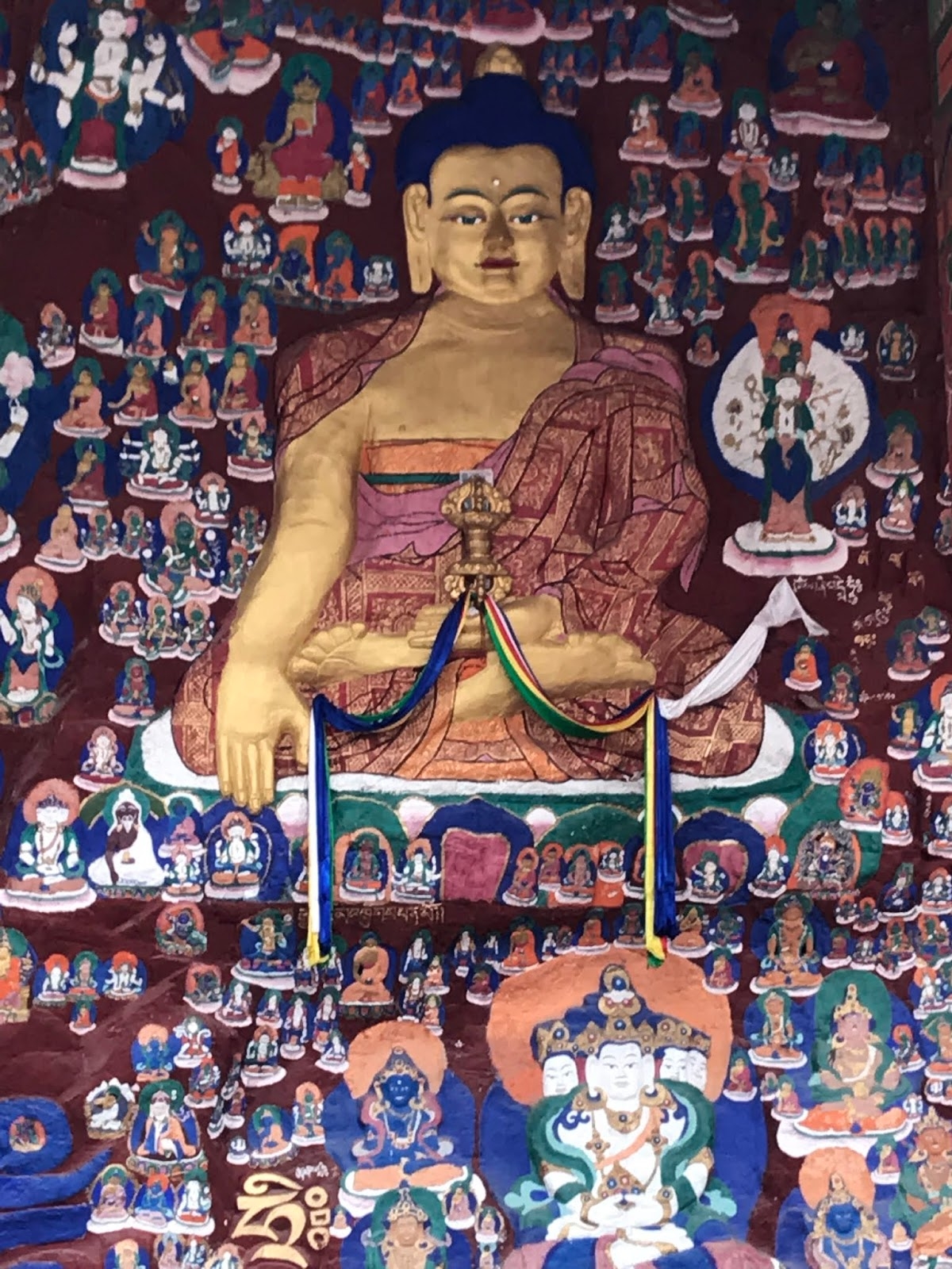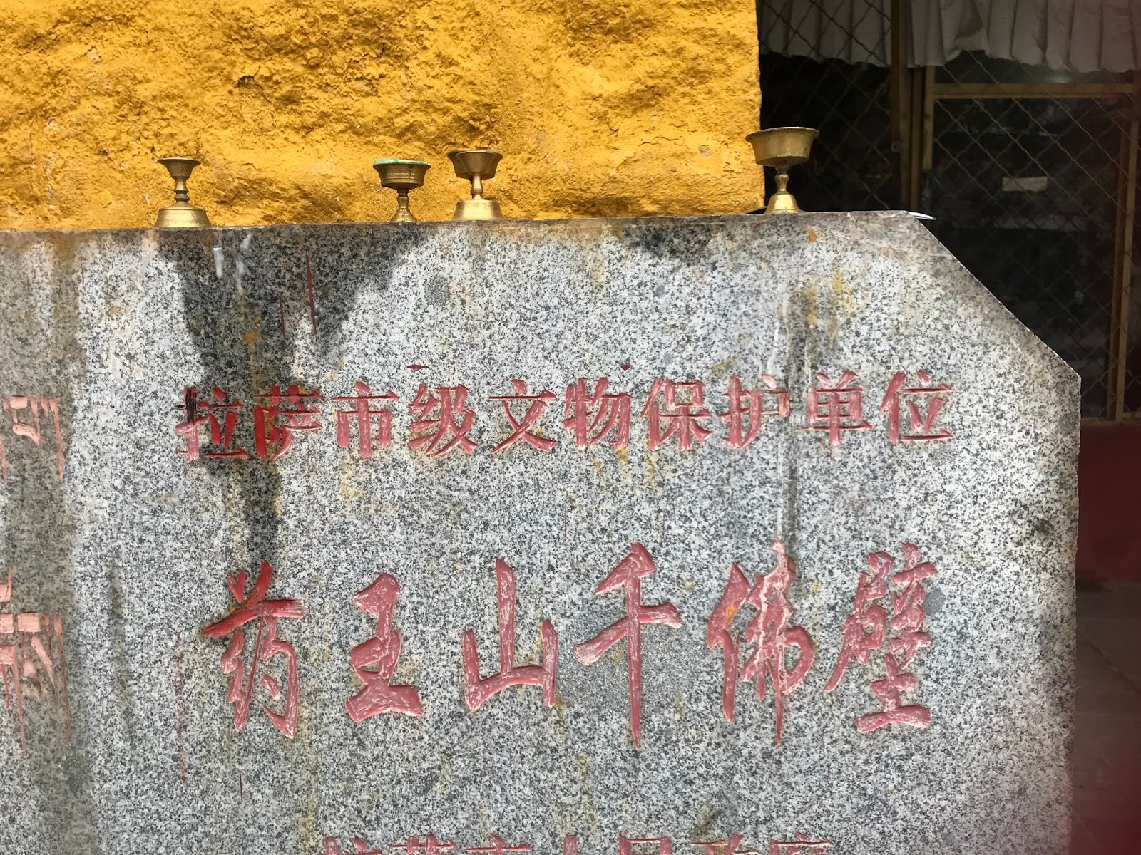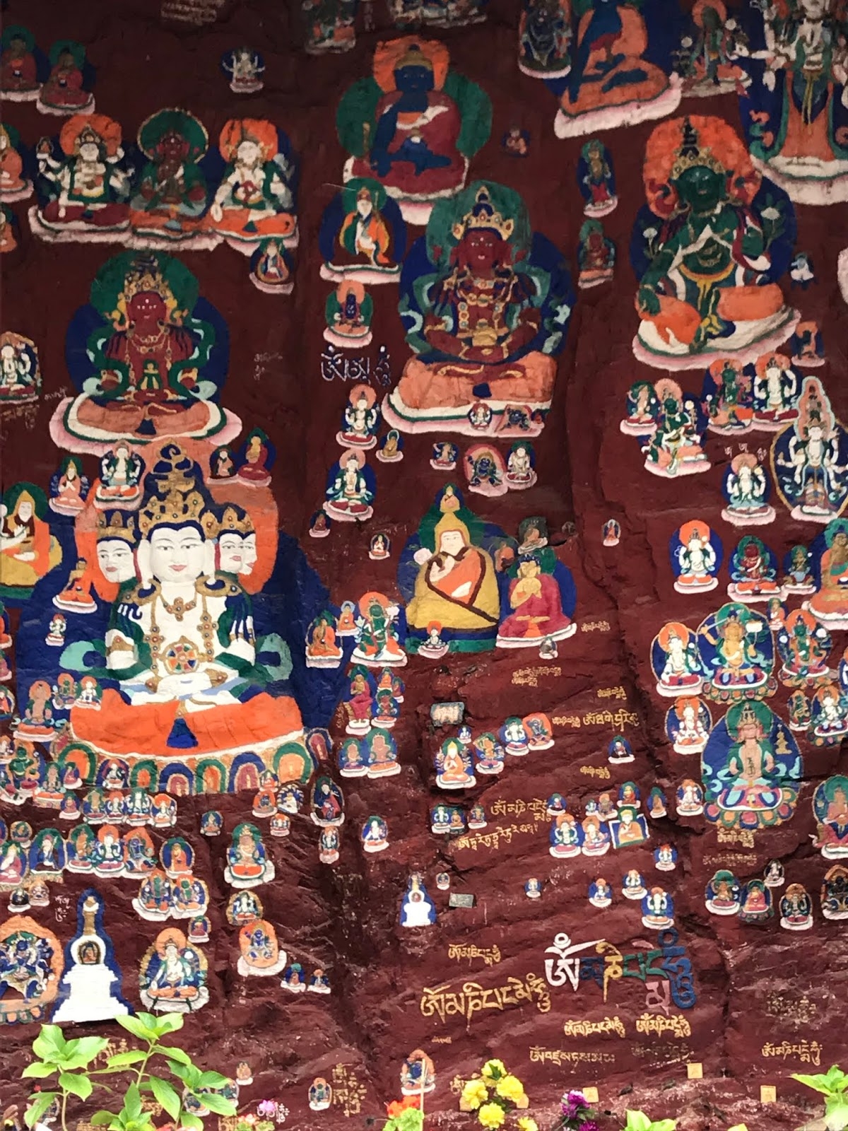 經年累計使得整個藥王山石刻垂直的石壁上遍布彩色佛像,