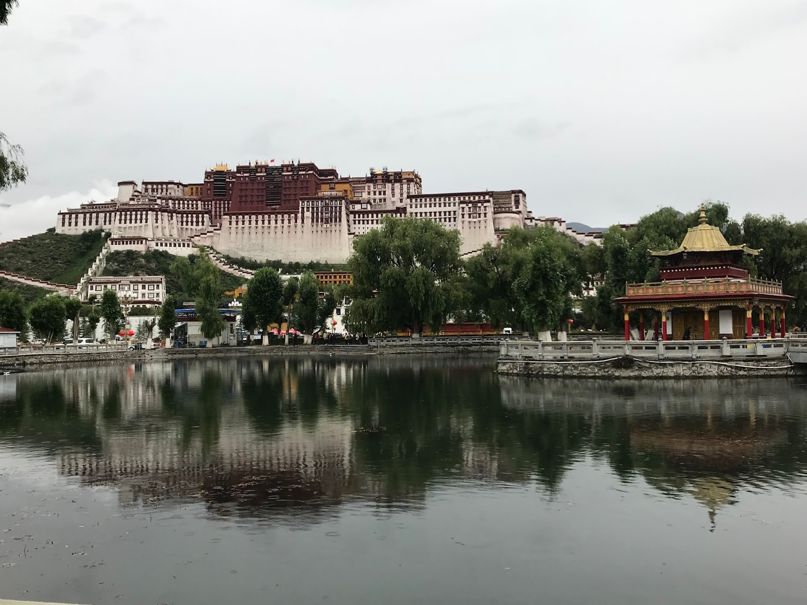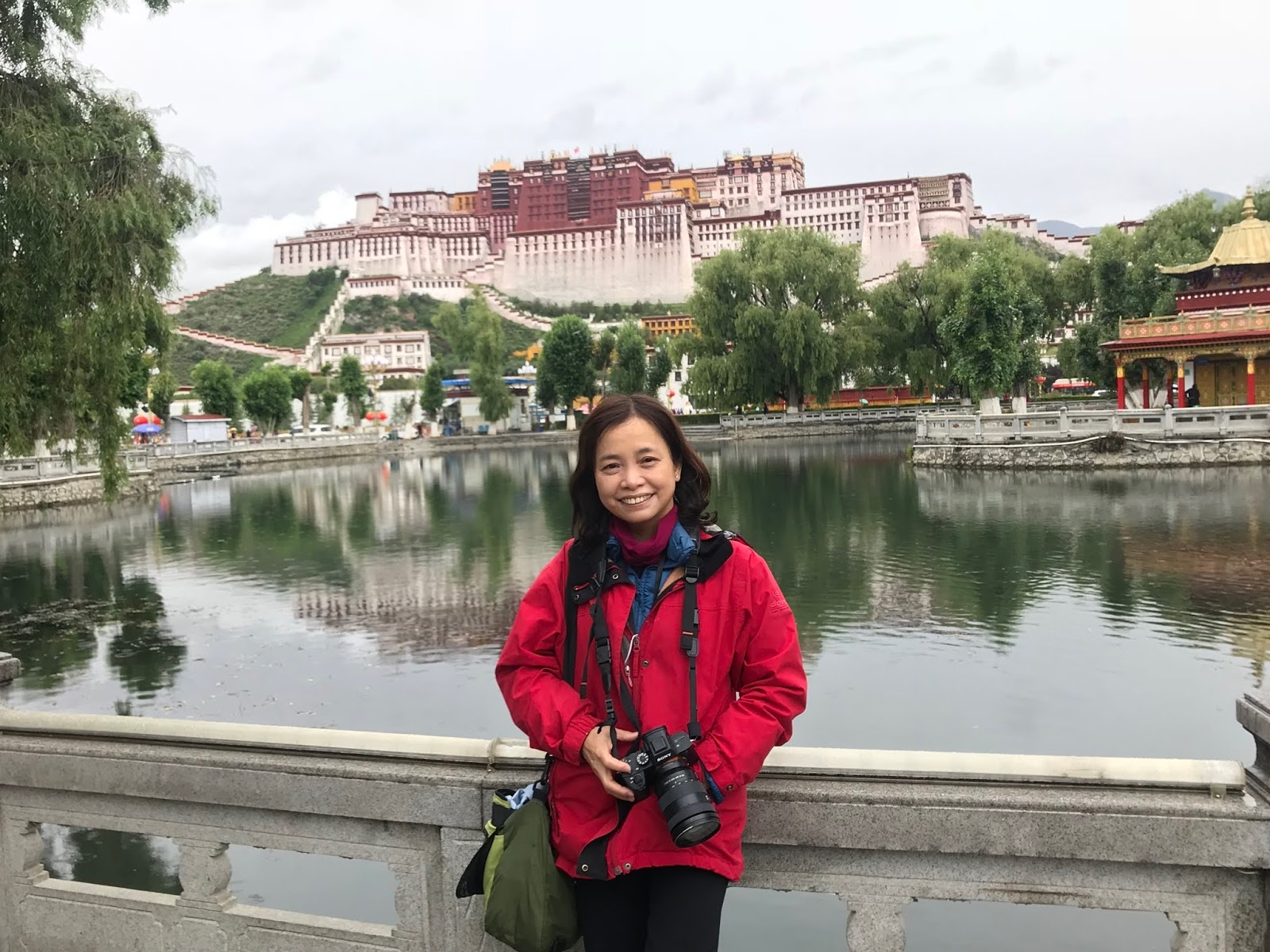 走到布達拉宮的對面的廣場、花園水池拍攝倒影,