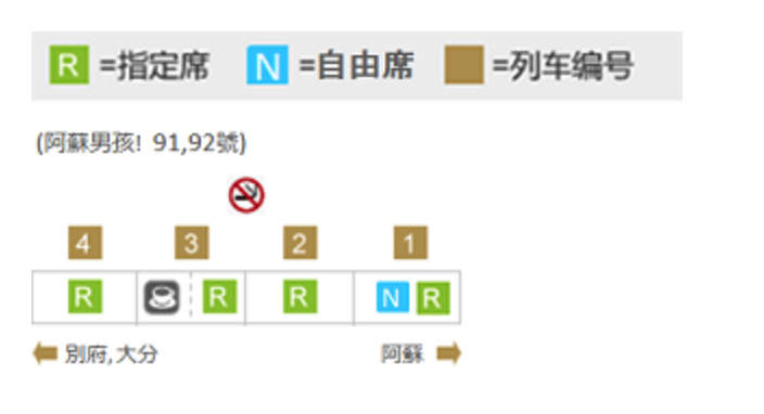 阿蘇男孩號的車列編成如下,就三輛列車(早期是四輛),除了極少數的座位是自由席,大部分都是指定席。使用北九州券或全九州券,都可以免加價劃位指定席(三日券可劃10次指定席,五日券可劃16次指定席)