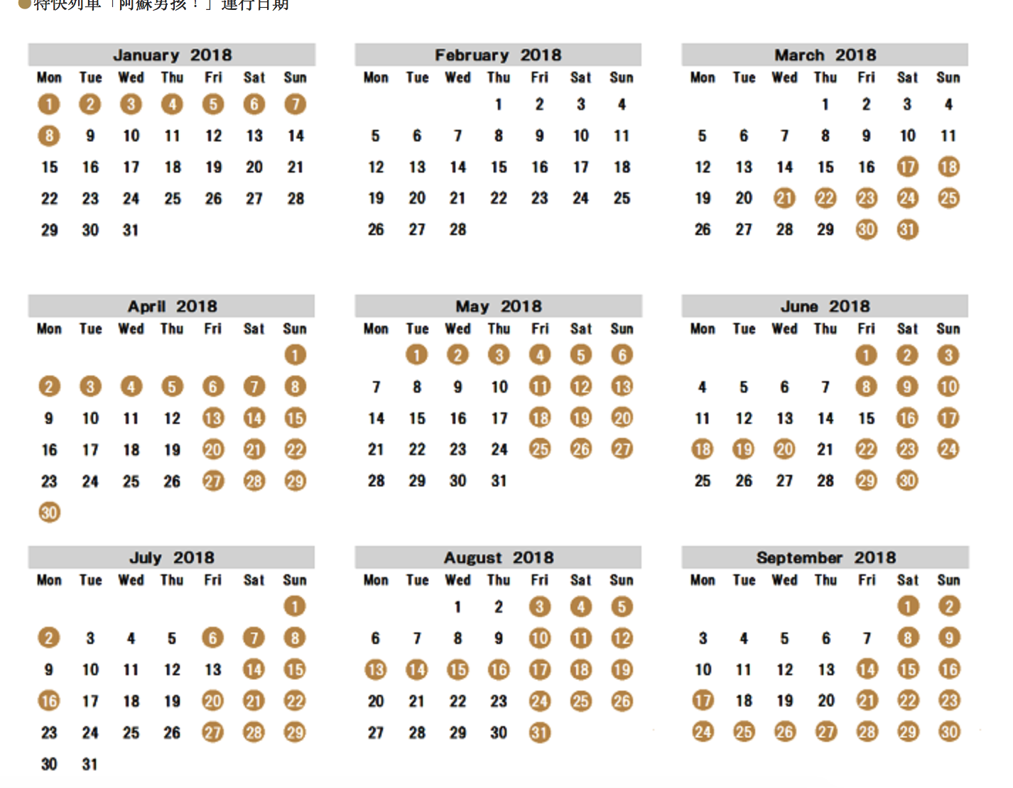 以下圖來看(2018/1-2018/9)的行駛日來看,它並不是每日行駛的特急列車,甚至整個二月份都沒有。想去搭的人,一定要把日期先看清楚。