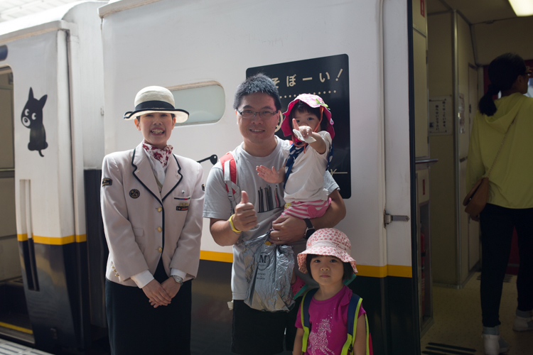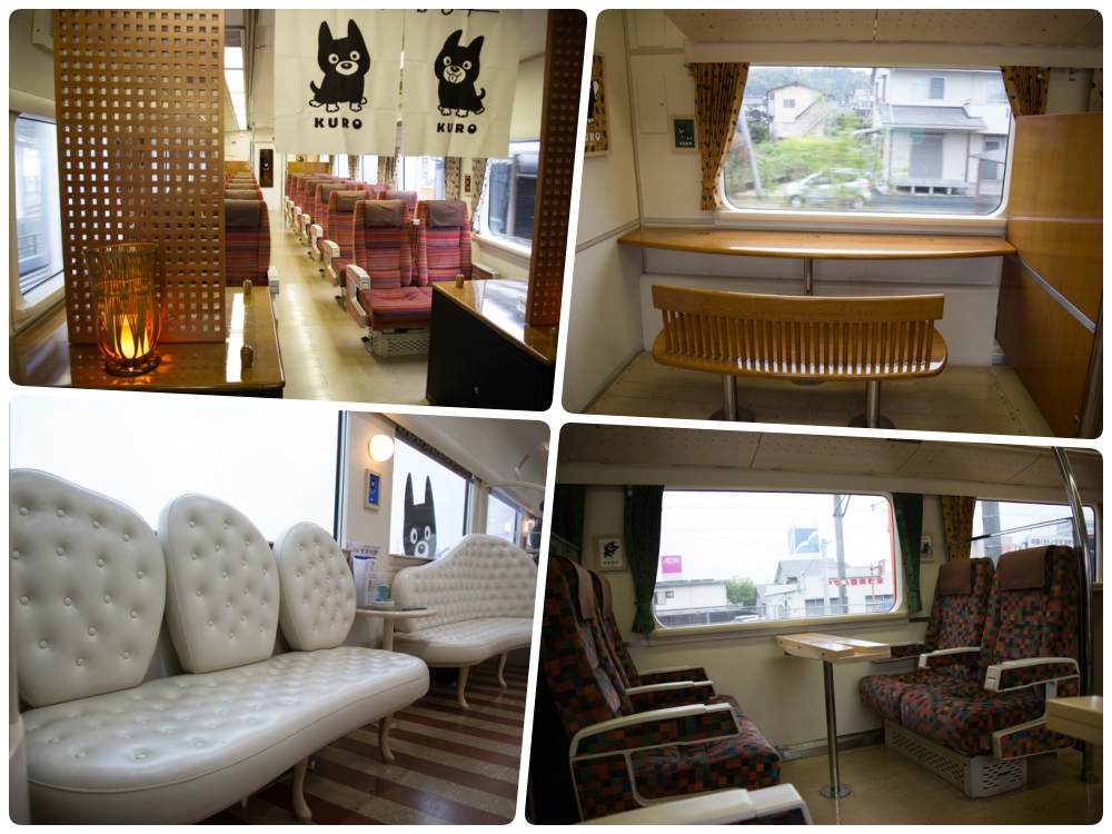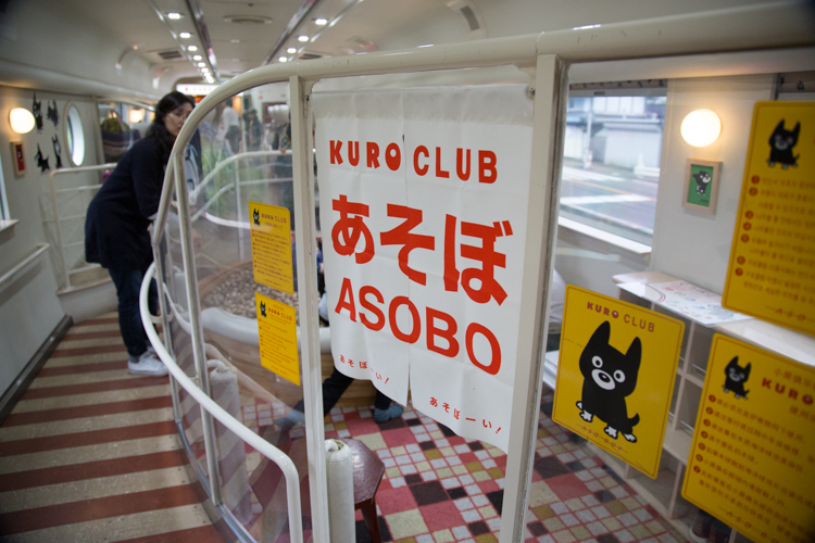車身是白的,劃滿了可愛的小黑狗くろ(Kuro)。隨車的服務員阿姨會穿著專屬的衣著,列車入月台停妥後,站在列車門邊,幫忙遊客拍照,或協助小朋友上車。