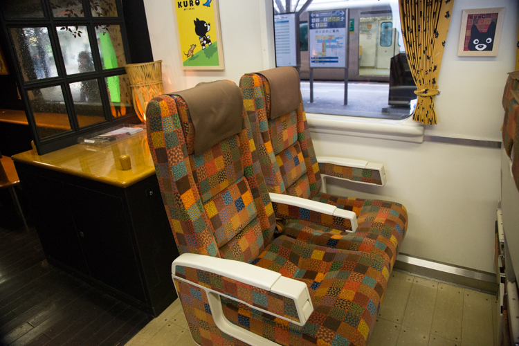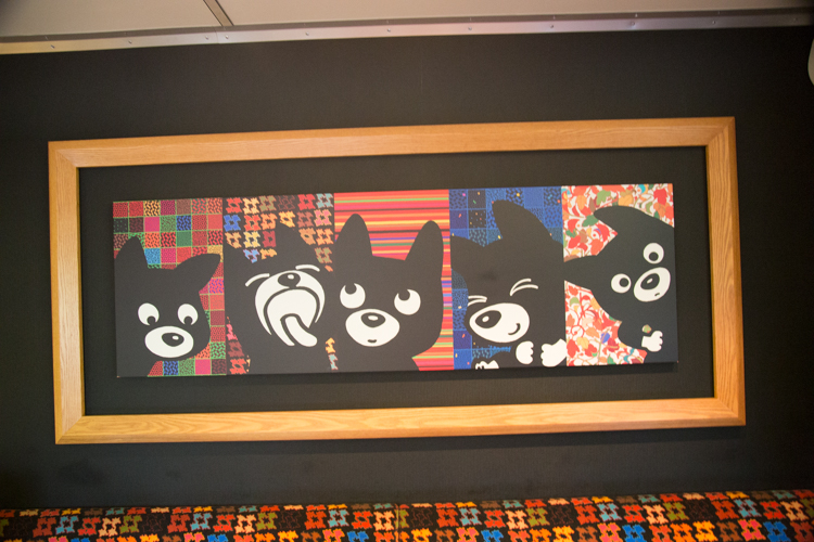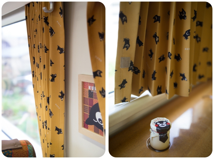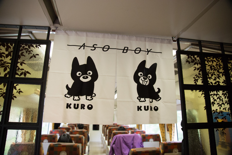 何止車身的塗裝是Kuro,從裡到外,從細節到全觀,都是這隻小黑狗。色塊拼布的絨布椅套,在沈穩中不失活潑,跨入觀景車頭的窗簾垂布,童趣中不失日式風情。連窗簾布上,都是Kuro在奔跑翻滾著的圖案。更別說掛在車身上的插畫,逗趣的Kuro擠眉弄眼。