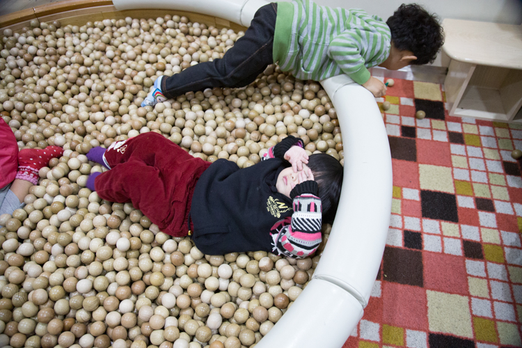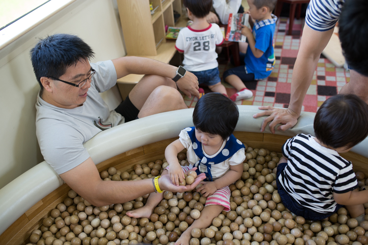 裡面是一個大的「原木球池」,在台灣只看過塑膠球池的我,第一次看到這溫潤的原木時,感到非常驚訝,質感好上千百倍呀!這時候真的想給貼心日本人一個讚!