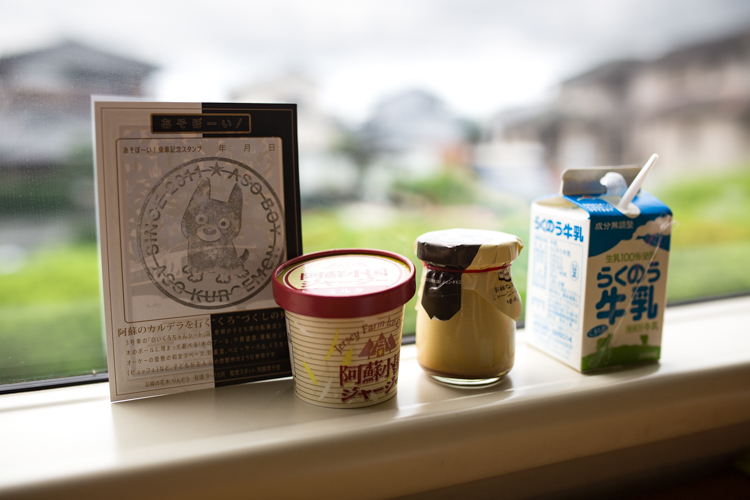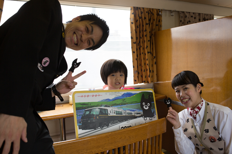 九州的D&S列車,車上都會有特殊的紙卡可以索取跟蓋章,蓋的章當然還是Kuro了。車上也有販售熊本熊布丁,跟以阿蘇牛乳做成的冰淇淋。雖然不是太便宜,但既然都在車上了,也不妨買來給小朋友嚐嚐看。