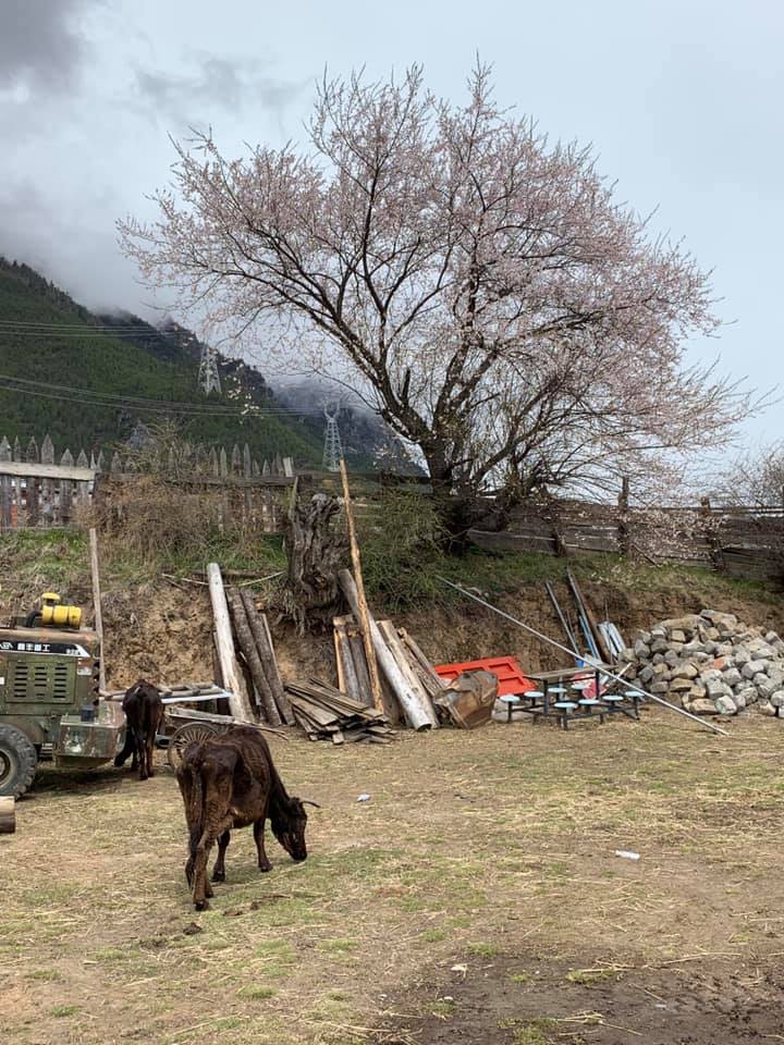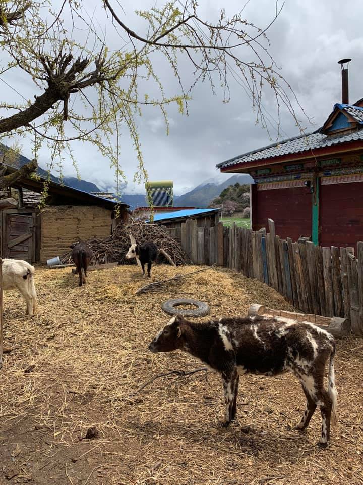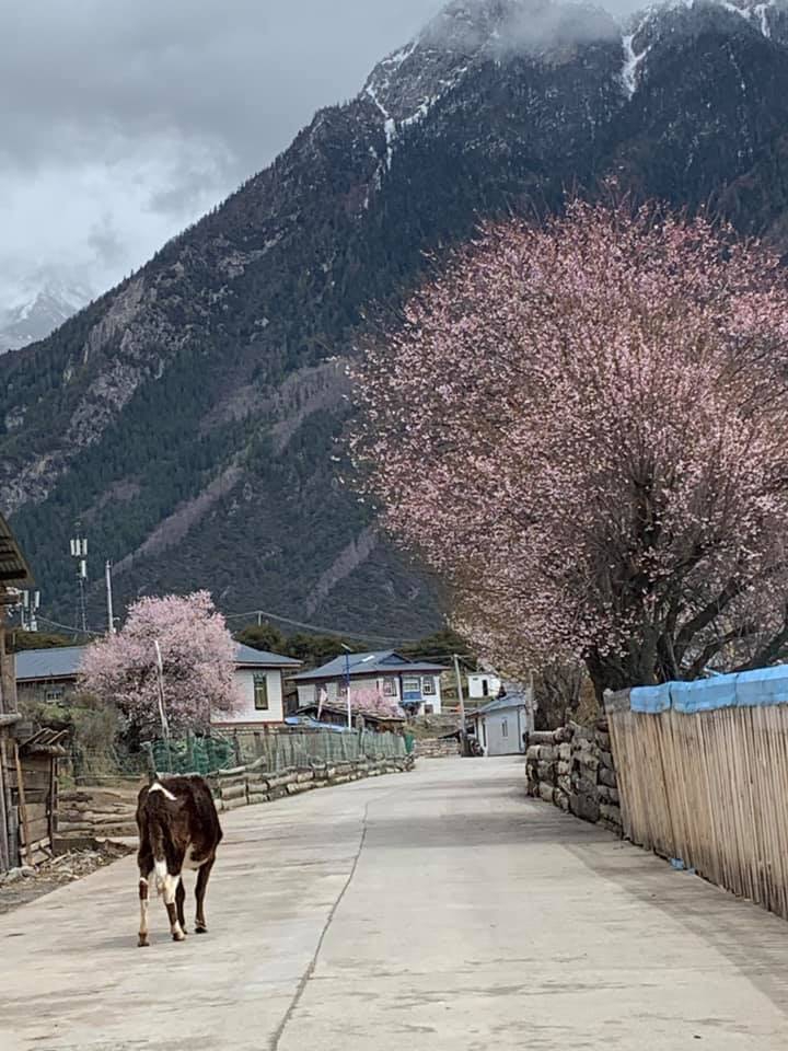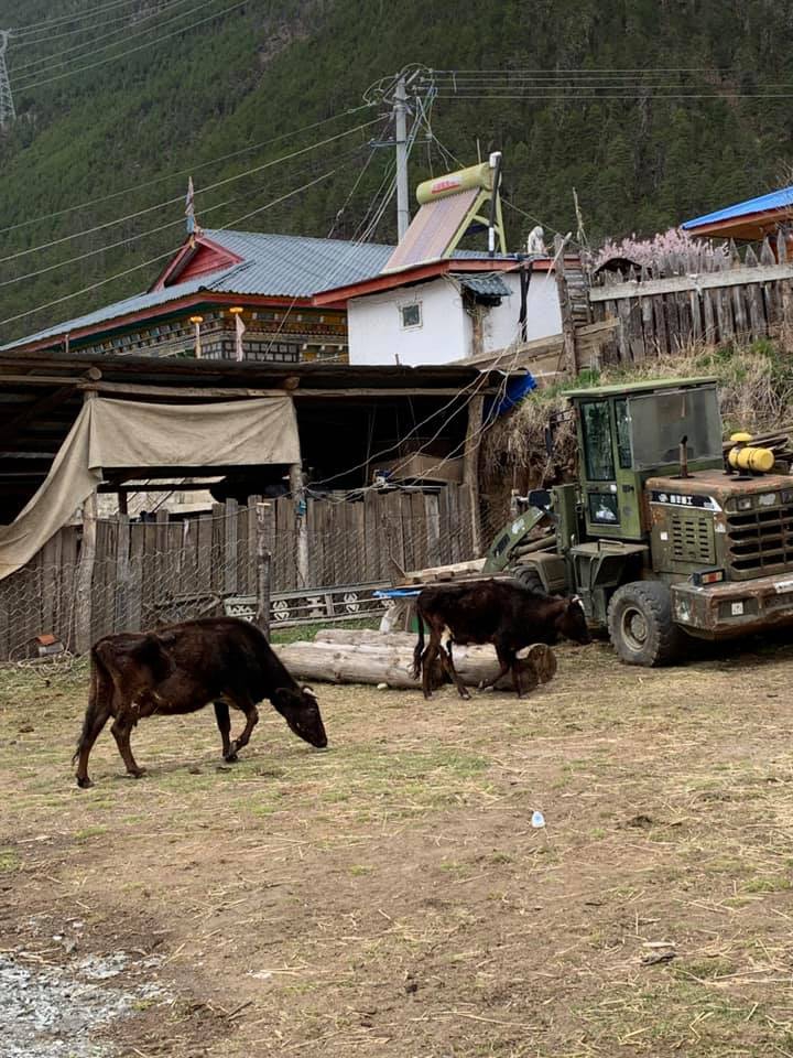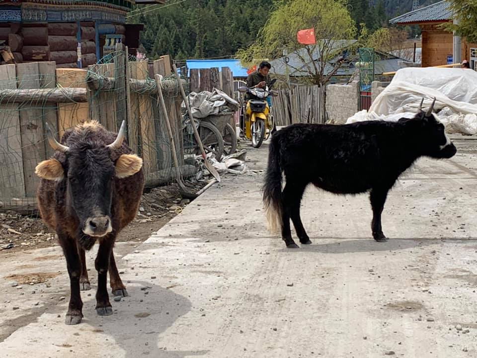 藏犛牛、藏偏牛在村路上視若無人的緩步,